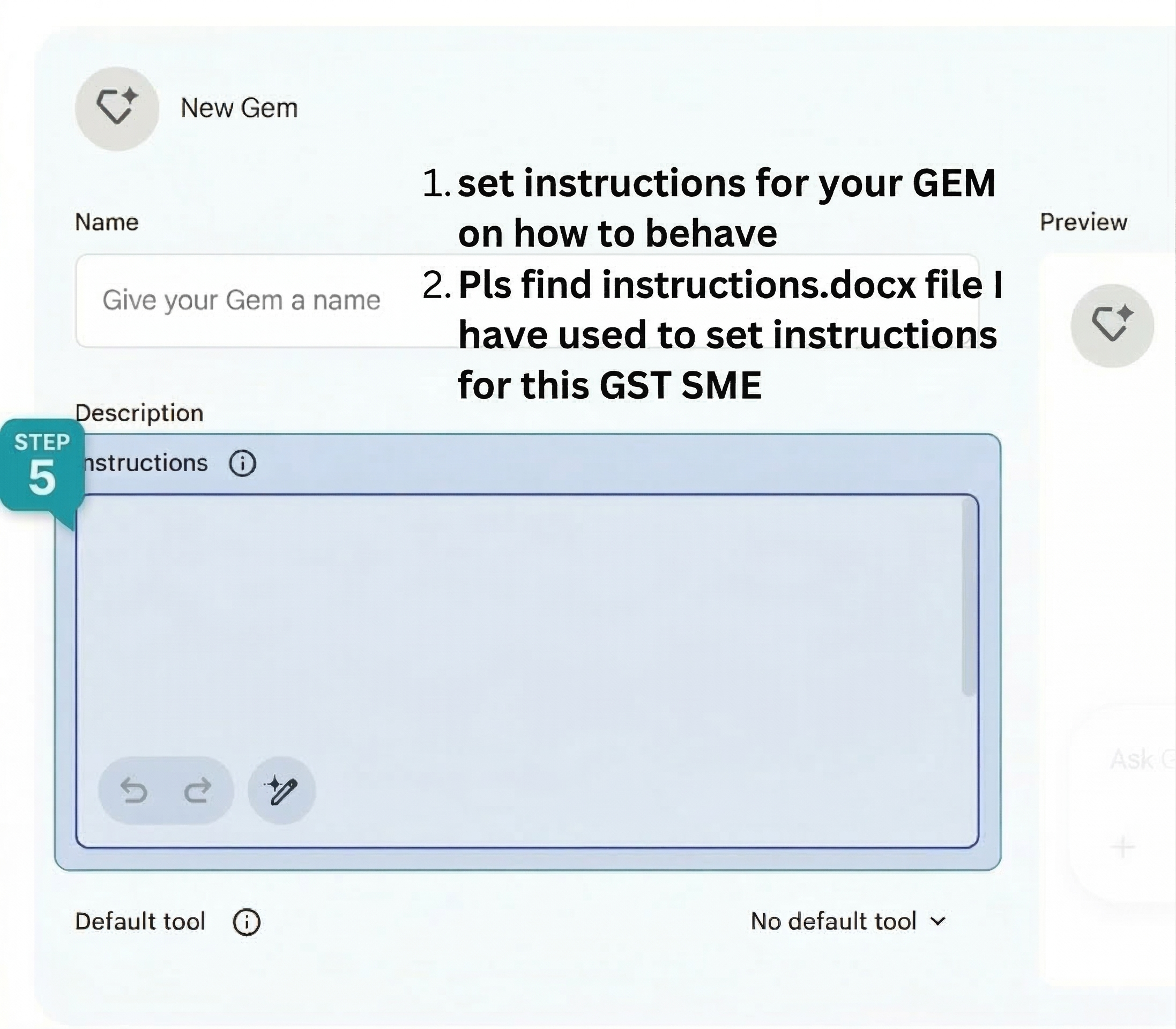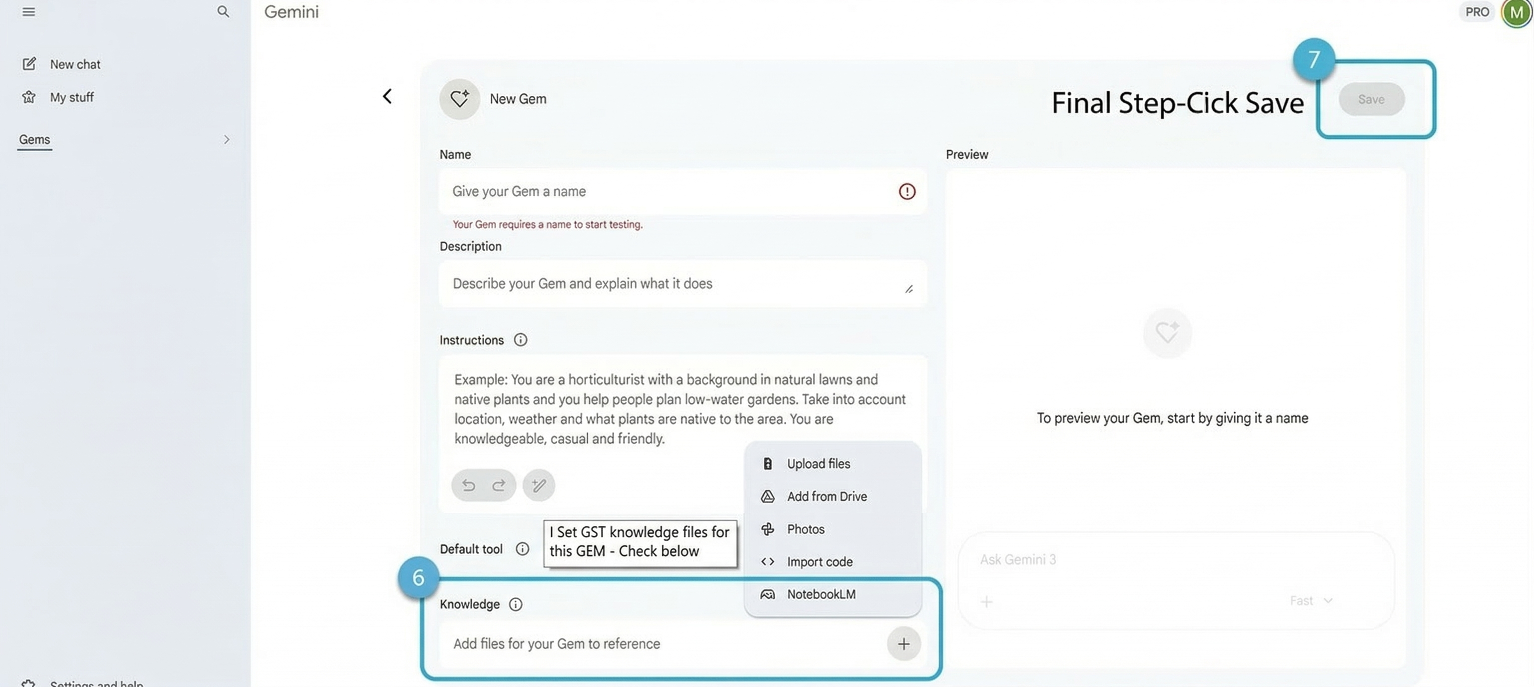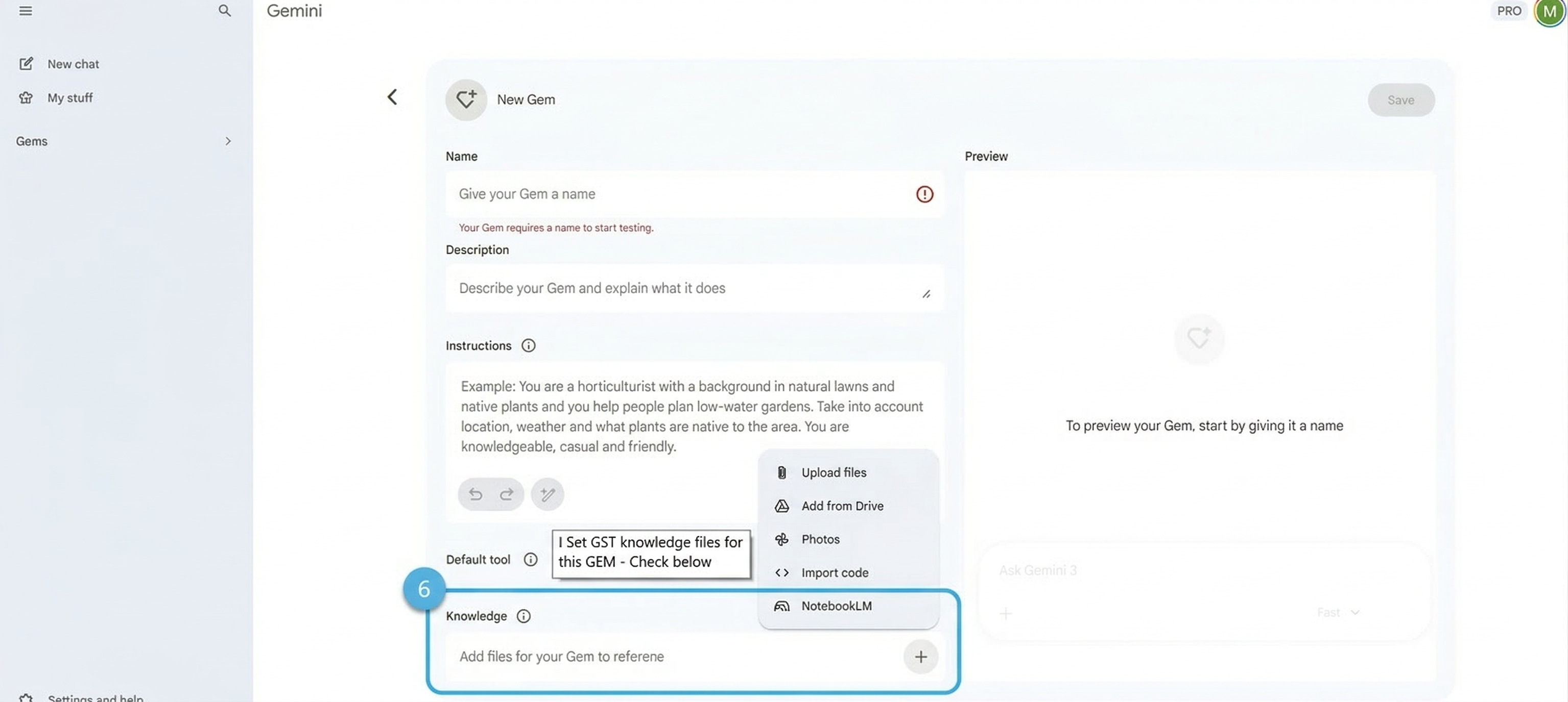 Upload reference files, style guides, or link relevant Google Workspace documents (e.g., ICAI GST materials).